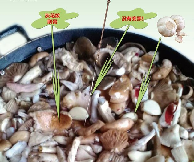 毒蘑菇和银器、大蒜、大米等接触不会产生反应,不会出现变色现象。