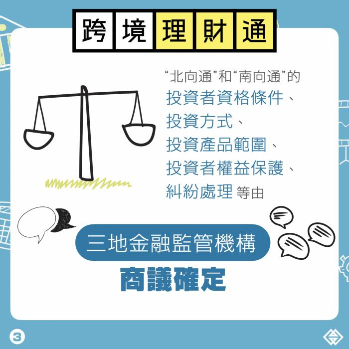 “跨境理财通”遵循三地个人理财产品管理的相关法律法规,同时尊重国际惯例做法。“北向通”和“南向通”投资者资格条件、投资方式、投资产品范围、投资者权益保护和纠纷处理等由人民银行、银保监会、证监会、外汇局、香港金管局、香港证监会、澳门金管局商议确定。