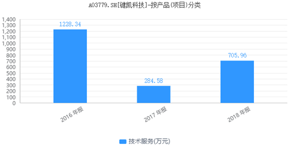 而一向被键凯科技所看好的为下游企业提供技术服务方面,在营收上的表现却一直不是很稳定波动较大,2016年-2018年的技术服务收入分别为1228.34万元、284.58万元以及705.96万元,2017年和2018年的变动幅度分别为-76.83%以及148.07%。报告期内,技术服务业务收入为公司所贡献的毛利几近于0。不得不说,键凯科技对于单一产品的依赖太过于严重。