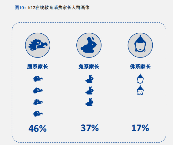 综合K12在线教育家长用户人群画像、消费行为、品牌偏好以及在线教育认知等多维度,该《报告》将家长分为鹰系、兔系、佛系三种不同类型。每种类型的家长均有各自明显的特点,细化用户分层一方面可以帮助家长挑选适合孩子的教学产品,另一方面助力K12在线教育机构根据不同用户需求研磨产品、提升服务。