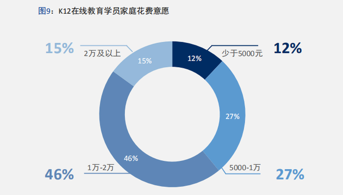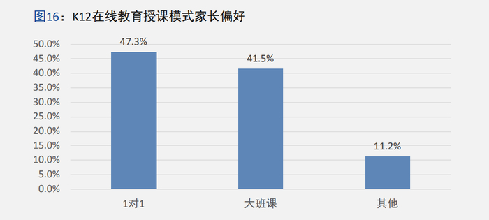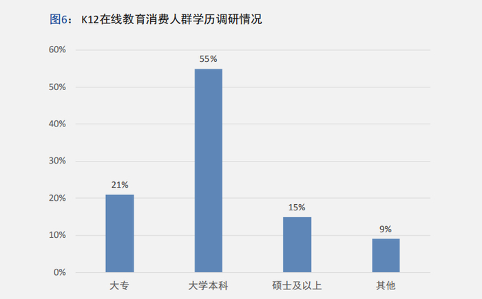 通过《报告》对受访家长的学历调研可以发现,K12在线教育用户的受教育程度普遍较高,有70%的家长拥有本科及以上学历,大专学历占比21%,其他占比仅为9%。这一数据同时也意味着接受过高等教育的父母,对子女的教育越重视,也越能接受在线教学的形式。