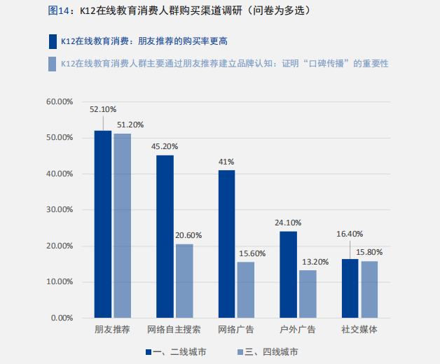 不管是来自哪一线城市,K12在线教育用户在选择品牌时,更信服亲朋友有推荐的产品,在一二线城市高达52.1%,三四线城市超半数达51.2%。这一数据也进一步说明K12在线教育品牌“口碑传播”的重要性。