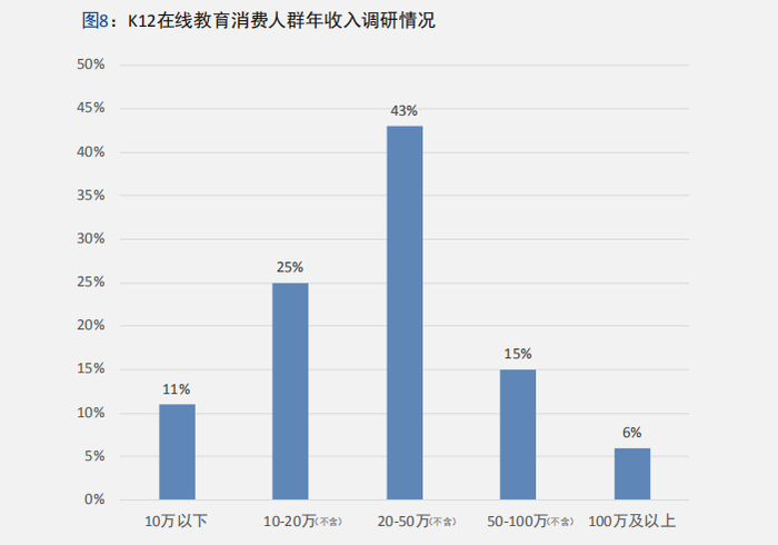 《报告》对受访者年收入水平调研后发现,K12在线教育市场的家庭往往拥有较强的消费能力,年收入在10万-100万区间的中产家庭占比达83%,这部分家长往往也具有较高的学历水平,非常注重孩子的教育,舍得为孩子的教育投资,是K12在线教育的消费主力军。
