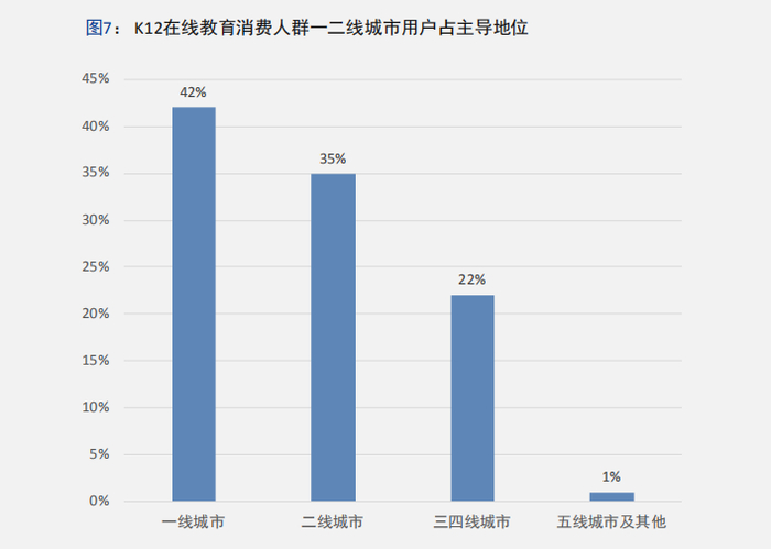 从《报告》数据来看,K12在线教育的消费主力军依旧集中于一二线城市,占比高达77%,其他城市总计占比仅为23%,在线教育资源分布不均衡的问题亟待解决,同时也意味着对众多K12在线教育品牌来说,三四五线城市的在线教育市场还是一个待开发的巨大金矿。