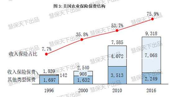从国际上看,作为全球规模最大的农险市场,美国自上世纪90年代推出收入保险以来,占比持续上升,目前已经成为绝对主流险种,2016年占比达75.9%。