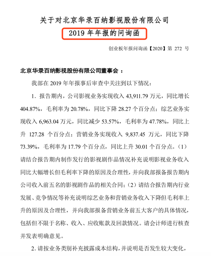 因此,深交所要求华录百纳结合2019年制作发行的影视剧作品情况,说明影视业务收入同比大幅增长但毛利率下降的原因及合理性,并向其报备收入前五名的影视剧作品相关合同。