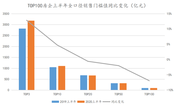 2020年上半年,受疫情等因素影响,TOP100房企全口径销售金额部分门槛值出现同比降低的情况。