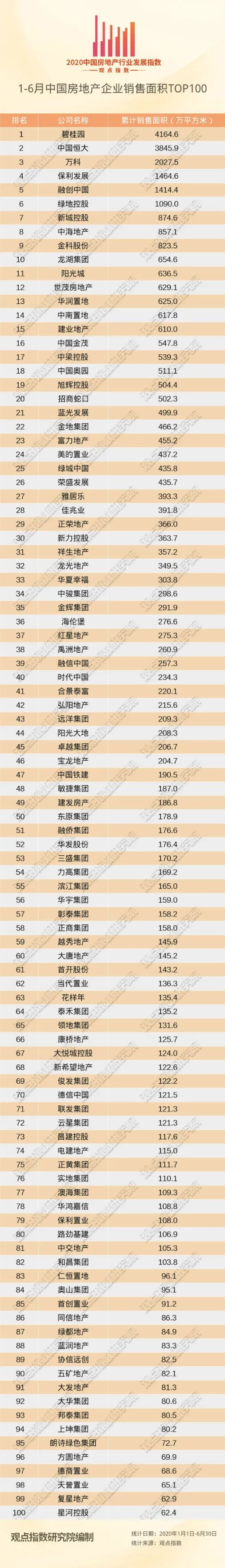 观点指数·2020年上半年中国房地产企业销售金额TOP100