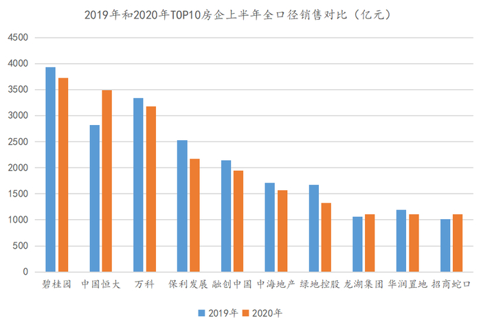 观察榜单头部企业,TOP3的房企分别是碧桂园、恒大、万科。与去年不同的是,恒大上半年加大营销力度,销售已然接近3500亿元,跃居至榜眼的位置。从销售金额来看,今年上半年前三甲的差距在逐渐缩小。2020年上半年,碧桂园、恒大和万科的销售额分别为3722.9亿元、3487.9亿元以及3180.0亿元,2019年同期则分别录得3934.9亿元、2818.0亿元和3340.0亿元。