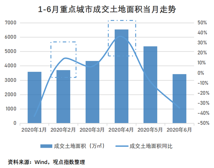 以观点指数监测的100个重点城市情况来看,上半年土地市场涌现了两波小高潮。2020年2月和4月,百城成交的土地面积分别同比增长13.80%、35.03%,成交总价分别同比增长17.23%、42.01%,今年2月的销售市场曾一度陷入低谷,直至4月才逐渐复苏。