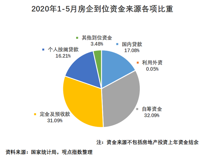 从各项所占比重来看,定金及预收款、自筹资金仍是房企到位资金的主要来源,两者合计占比六成。紧接其后的是国内贷款,占比17.08%。