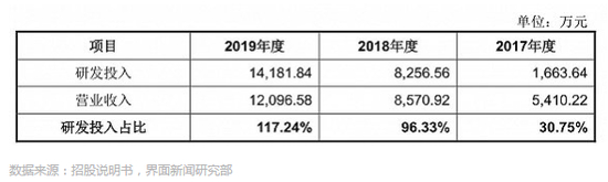 但实际上,公司的研发投入不仅大大超过利润表上的研发费用,还超过了营业收入。2017年到2019年,公司研发投入分别为1664万元、8257万元和14182万元。