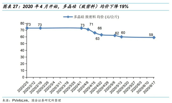 •根据PVinfoLink 光伏市场价格跟踪,2020年4月开始,多晶硅(致密料)均价从73元/公斤下降至59元/公斤,下降幅度为19%。