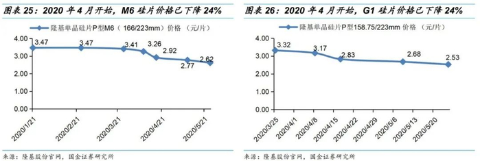 •2020年4月开始,隆基股份M6硅片官网价格已下降24%;隆基股份G1硅片官网价格也下降了24%。