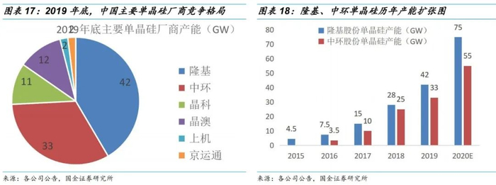 •截至2019年底,主流光伏单晶硅产能约为100GW左右(隆基42GW+中环33GW+晶科11GW+晶澳12GW+上机2GW以上)。隆基和中环在单晶硅片环节的产能占比高达70%以上,呈现双寡头垄断格局。