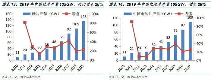 •根据中国光伏行业协会统计,2019年中国硅片产量约为135GW,同比增长26%。全球前十大硅片生产企业均位居中国大陆。中国硅片市场一定程度上基本代表了全球市场。