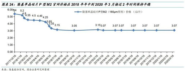 •隆基股份M2硅片官网价格在2018年年中到2020年3月接近2年时间保持平稳。