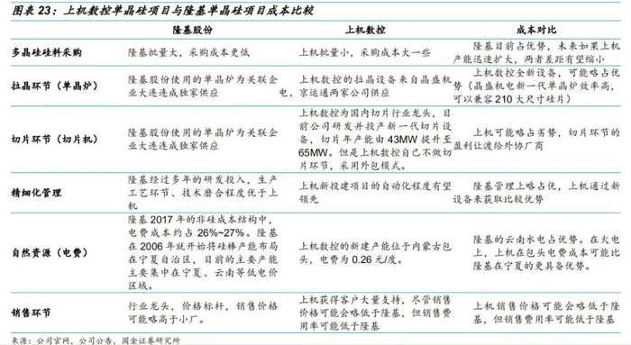 •上机数控相对比较优势有:(1)上机数控的设备为全新设备,在整体效率上可能略高些(隆基股份有些老设备),同时新上的部分设备具备兼容210大尺寸硅片的生产能力;(2)上机数控和下游电池片、组件客户不存在竞争关系,销售有可能更顺畅些。