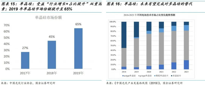 (2)单晶硅受益“行业增长+占比提升”双重因素,有望大幅增长。2019年单晶硅片市场份额为65%,我们预计很快将提升至90%以上。