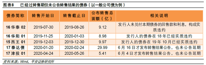 交易所债券流程已经规范化的情况下仍有个别债券在已过转售期的情况下也没有发布转售结果公告,主要是受到违约等事项的影响。我们挑选五支已经过转售期但还没有发布转售结果的一般公司债,发现有三支债券在转售前已经发生违约,还有两支债券的发行人未发生过违约,最后也发布了转售结果公告,但公告日期比较靠后,尤其是“17泰达债”在转售截止日之后4个月才公告结果,且并未公告转售延期。