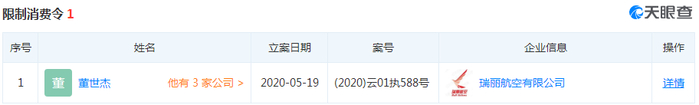 2020年6月18日,昆明市中级人民法院对瑞丽航空董事长董世杰下达了限制消费令。