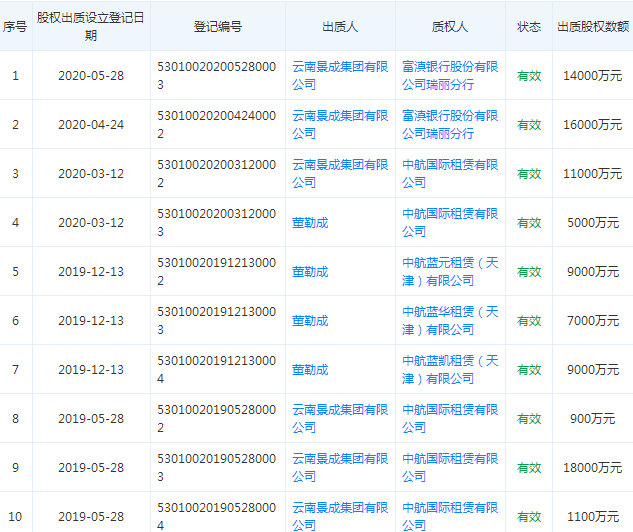 云南景成集团出质6.1亿元的股权。