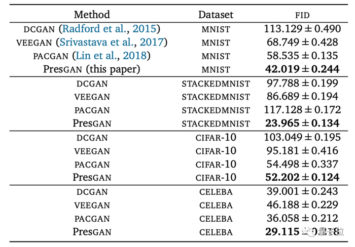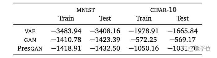 就传统GAN与变分自编码器(VAE)之间的预测对数似然性而言,PresGAN缩小了性能差距,如下表所示。