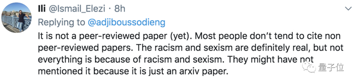 她说自己的这篇论文,去年就公布在arXiv上,9个月来只有区区4次引用(其中一次还是她自己),就是因为她是黑人女性。假如主要研究者是一个白人男性,情况肯定大不相同。