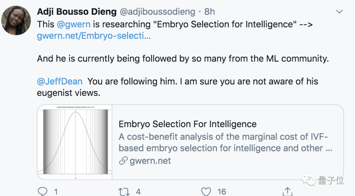 她翻出了一篇Gwern之前撰写的,有关试管婴儿技术中智力基因性状选择的成本研究文章,以此,她指控Gwern是一个优生主义者,所以她拒绝与Gwern进行任何对话。