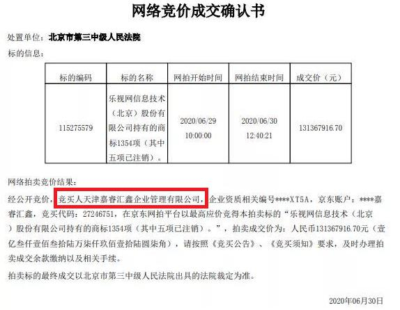 事实上,乐视网的商标资产之所以会被送上拍卖席,源于乐视网的债权人嘉睿汇鑫申请强制执行的仲裁裁决,而有趣的是,本次拍卖,乐视网的商标也正是被嘉睿汇鑫所购得。