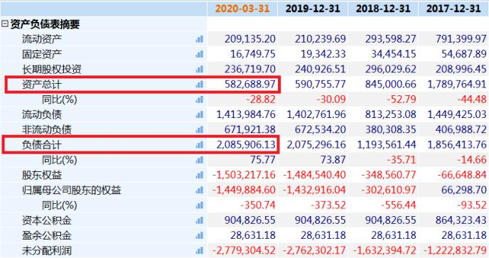 而自2017年起,乐视网更是连年亏损,三年累计亏损290亿元,亏损的同时对外的债务并没有偿还完。wind数据显示,截止2020年一季度末,乐视公司资产总计58.27亿元,而负债则高达合计208.59亿元。