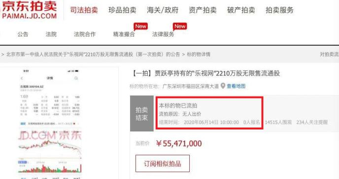 6月13日,北京市第一中级人民法院对贾跃亭持有的“乐视网”2210万股无限售流通股司法拍卖。起拍价为5547.1万元,保证金1100万元,增价幅度20万元。