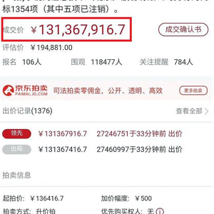 整场拍卖共106人报名,117220人围观,出价1376次,竞争十分激烈,部分出价时间仅相隔1分钟。且由于延时出价的设定,原定于2020年6月29日10时至2020年6月30日10时止的公开拍卖,最终于12点40分结束,超时两小时。
