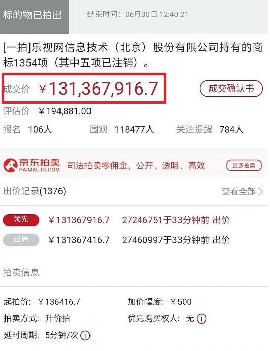 昨日,乐视网持有的1300多个商标上线京东拍卖平台司法成功拍卖,起拍价为13.64万元,最终成交价为1.31亿元,溢价竟高达近千倍。