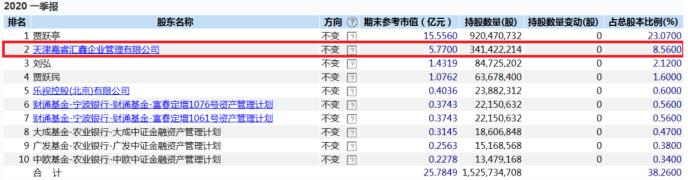 此外,Wind数据显示,截至2020年一季度末,嘉睿汇鑫也是除贾跃亭外的乐视网第二大股东,持有乐视网股票3.41亿股,占股8.56%。