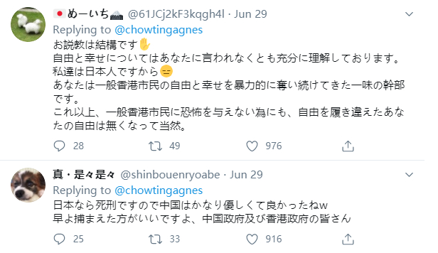 还有日本网友提醒她说:“(上述罪行)在日本的话就是死刑,中国已经很仁慈了。中国/香港政府,早点逮捕他们吧。”