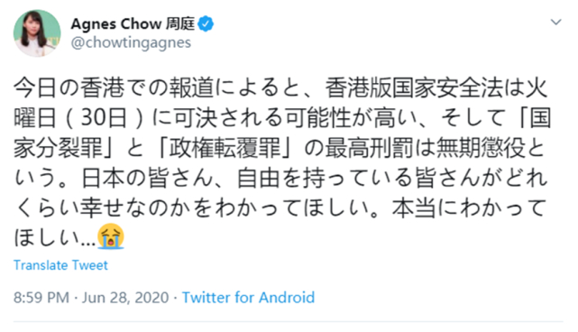 6月28日,乱港分子周庭在推特上发布了一段话,意图博取日本网友的同情:“今日香港媒体报道,香港《国家安全法》很可能在周二(30日)通过,而‘国家分裂罪’和‘颠覆政权罪’的最高刑罚是无期徒刑。我希望日本民众知道,拥有自由的你们是多么的快乐,我真的希望你们可以知道。”