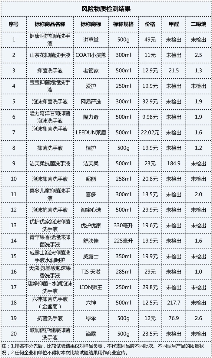 检测结果显示,全部样品均符合国家规定的限量要求,其中8款抗(抑)菌洗手液样品未检出甲醛、二噁烷,表现较好。