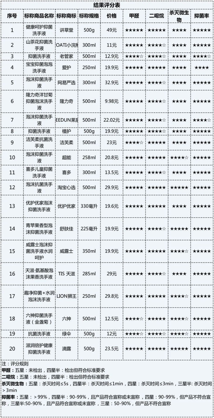 检测结果显示,杀菌性能上,20款样品均能杀灭规定的菌落数量,但杀菌速度差异明显,其中淘宝心选、滴露、舒肤佳杀菌最快,能在5秒内迅速杀菌。