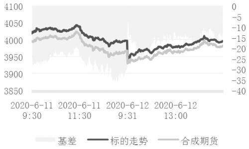 但6月12日沪深300期指收红,开盘价就是当日的最低点。从合成期货上来看,6月11日合成期货贴水在-30左右。但在6月12日开盘时,合成期货贴水突然缩小,从-30收敛到-7,最低的时候为-4左右。合成基差大幅收敛,说明合成期货跌幅没有标的深。