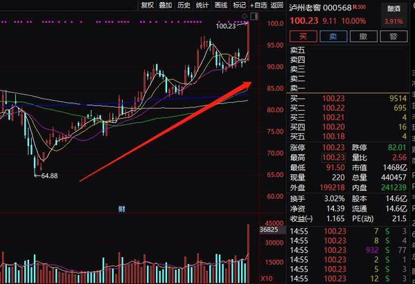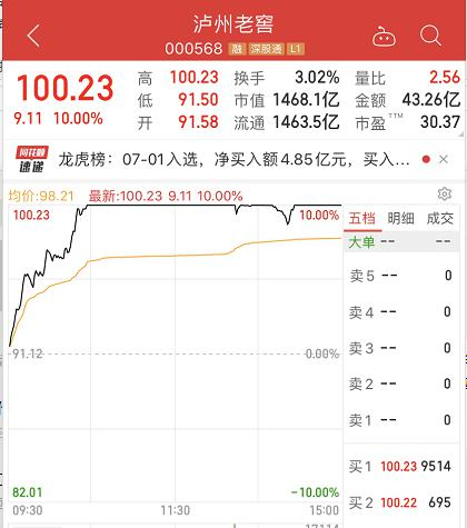 6月30日股东大会,7月1日开盘后泸州老窖高开高走,封住涨停,涨10.00%,收报100.23元,股价创历史新高,全天成交额43.3亿元,明显放量,最新总市值为1468亿元。今年3月份底部以来,泸州老窖的涨幅已经超过50%。
