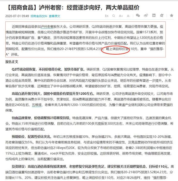 招商食品饮料团队认为,当前位置老窖的预期较低、配置性价比突出。我们维持20-21年EPS预测3.52和4.23元,略上调目标价至110元,重申“强烈推荐-A”评级。