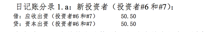 根据表6.1.c中的均衡计算,该日记账中的金额应只划分给新投资者#6和#7,分别划分20.20和30.30。