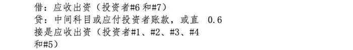 该款项应由新投资者支付给原有投资者。可以使用中间科目,因为该科目有进有出,或可另设单独会计科目,或使用现有的应付投资者(或类似)科目,或直接计入原始投资人应收出资科目(即示例中的投资者#1、#2、#3、#4和#5)。只要记账方式简洁且与会计核算政策与方法一致即可。