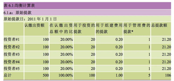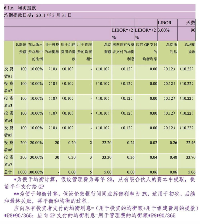 两表之差为均衡额。同时需要分别计算每个项目,即用于投资、组建费用/创立成本、基金支出/合伙支出以及管理费/优先收益的金额。或者,至少单独计算应向GP支付的管理费/优先收益的金额,其他款项则是支付给原有投资者(该做法并不推荐,应当跟踪记录每一个项目)。