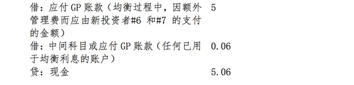 投资、组建费用/创立成本及合伙支出/基金支出的均衡额,以及管理费/优先收益的均衡额应贷记资本账户(美元基金或类似基金)或新投资者的资本账户。