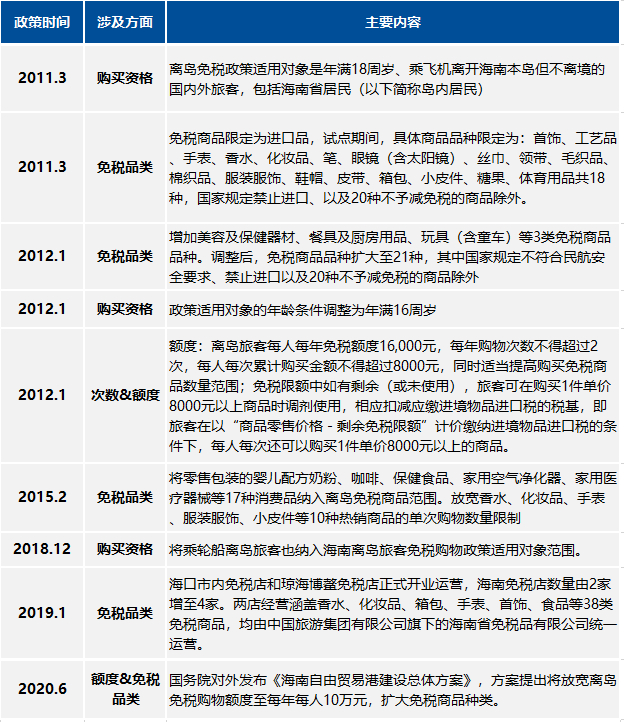6月29日,财政部、海关总署、税务总局发布《关于海南离岛旅客免税购物政策的公告》。按照公告,此次免税购物额度从每年每人3万元提高至10万元,离岛免税商品品种由38种增至45种,取消单件商品8000元免税限额规定。
