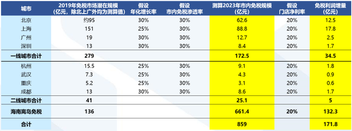 若仅考虑北上广深四大一线城市,预计2023年市内免税市场有望达到172.5亿收入、34.5亿利润的体量。