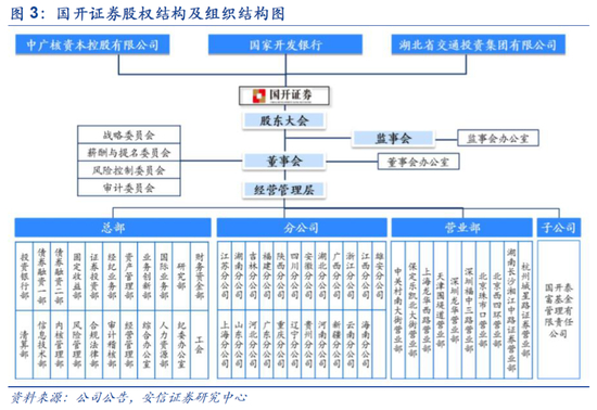 国开证券是国开行直接控股公司。国开证券是由国开行直接控股的证券公司,是开发银行在收购原航空证券(成立于2003年)全部股权基础上增资更名而来,公司注册地址为北京市。2017年9月25日,国开证券正式变更为股份有限公司,标志着公司股份制改造顺利完成。第一大股东为国家开发银行,持股比例80%;第二大股东中广核资本控股持股比例15%,第三大股东湖北交通投资持股比例5%。国开证券有1家子公司(国开泰富基金)、23家区域分公司和10家营业部。