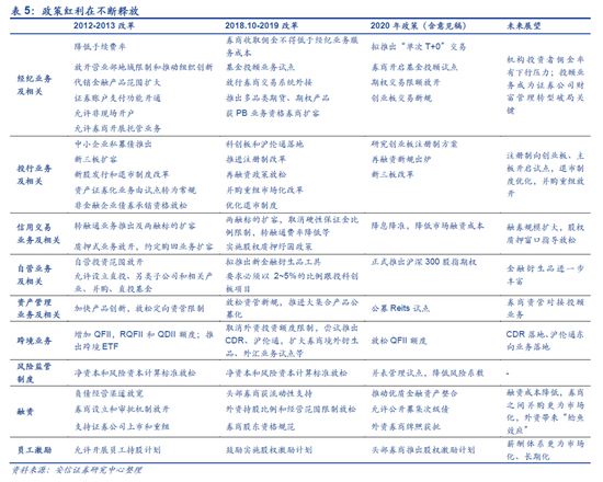 推动资本市场自身的改革和升级。资本市场改革主要围绕以下方面:(1)扩大对外开放。监管部门陆续放开资管、证券等行业的外资持股限制,境外资金扩大入A规模和范围,券商国际业务布局持续推进。(2)推进注册制改革。包括推进科创板和创业板注册制试点、再融资新规松绑等,注册制推动券商传统投行业务向“投行+投资”或“精品投行”转型。(3)推动财富管理转型,引导长线资金入市。包括推动基金投顾业务试点、MOM产品获准发行、银行理财资金获准开设股票账户等,有助于引导居民财富和长期资本进入股市,推动股市良性发展和支持实体经济。(4)推进金融工具多元化、专业化。监管部门推动期权品种丰富化,推动GDR、公募Reits等新品种落地。